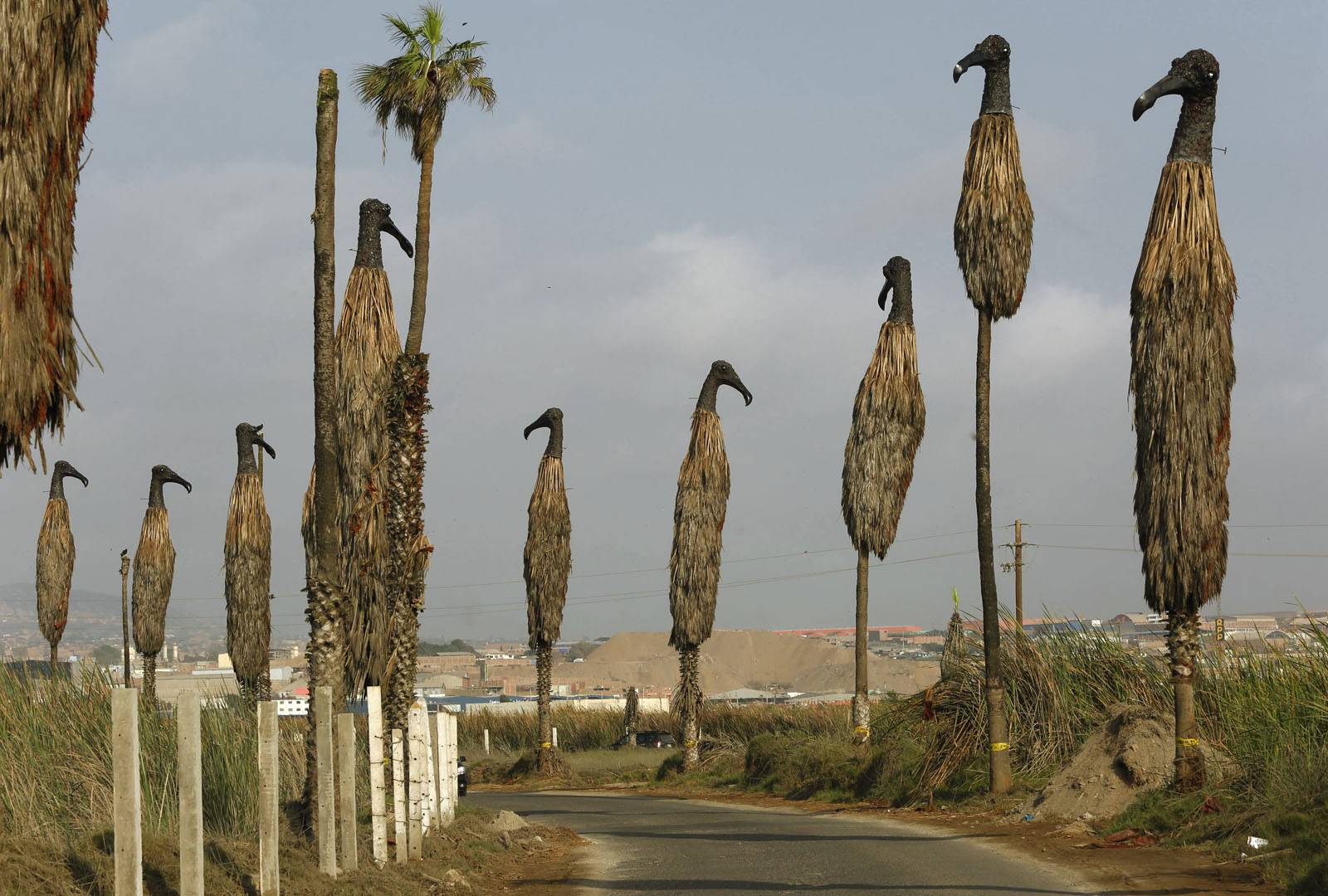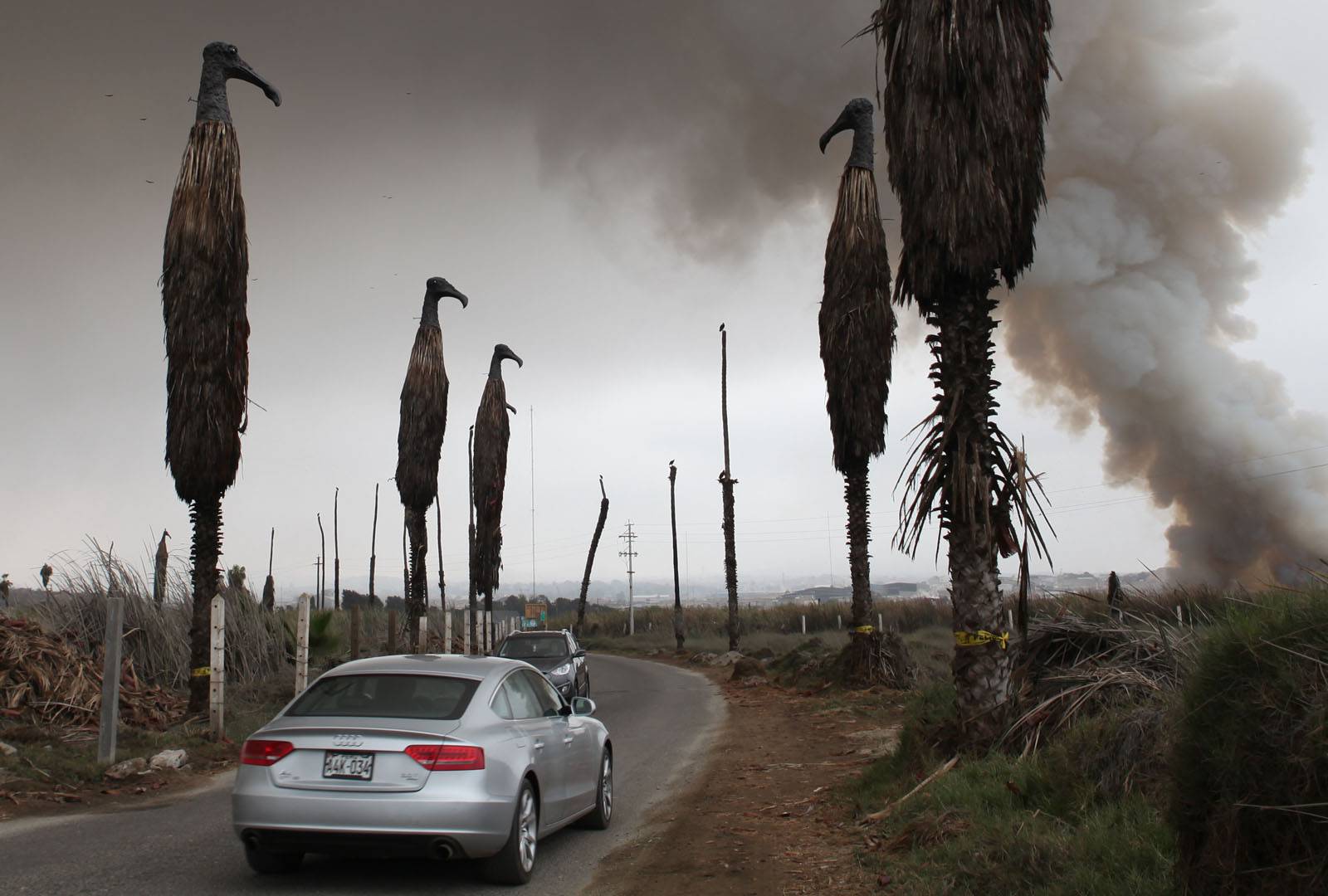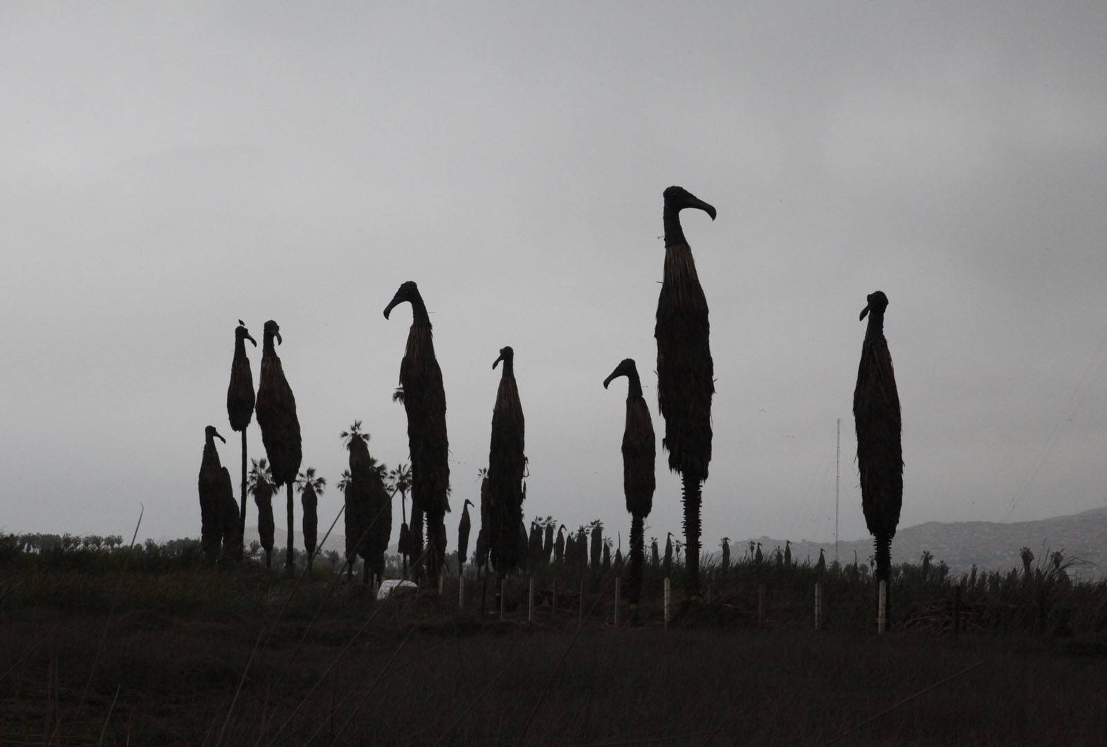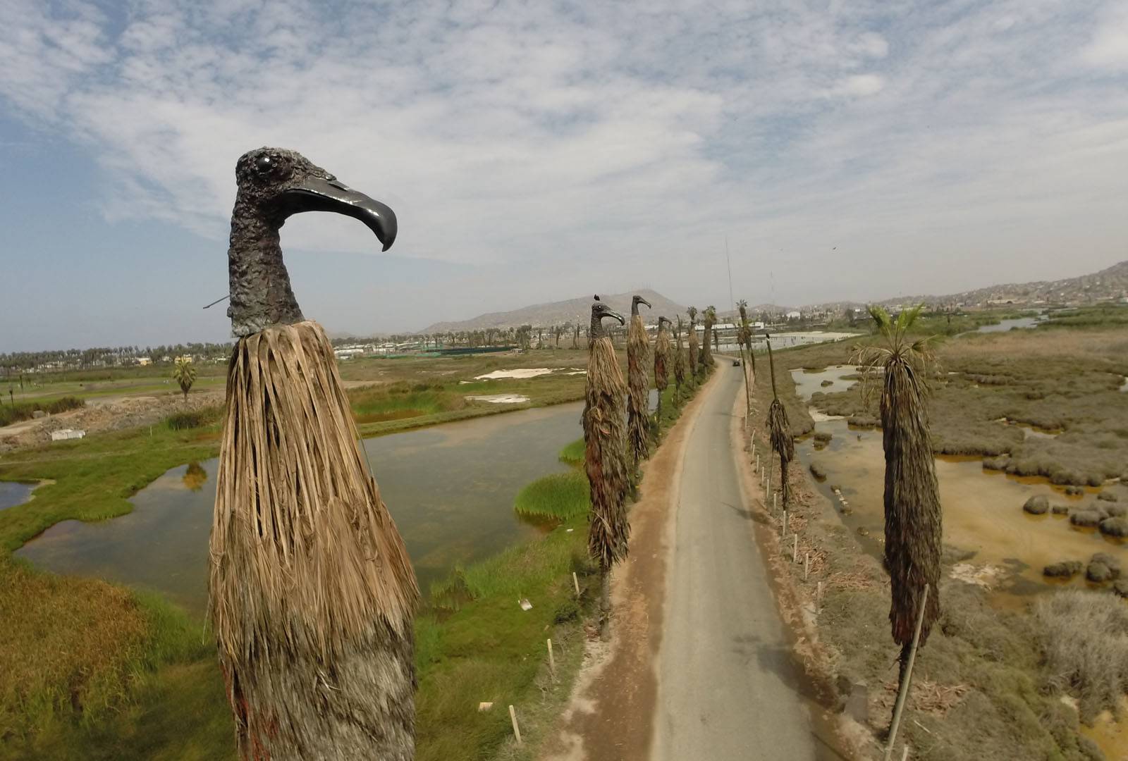 During the UN Climate Conference in Lima, in the Nature Reserve Marshes of Villa –a natural habitat of migratory birds located in the outskirts of Lima– the artist made a temporary intervention of 25 dead palm trees 15 meter tall.